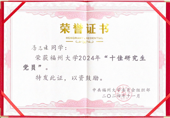 2022级硕士研究生李志煌,获评福州大学首届十佳研究生党员!