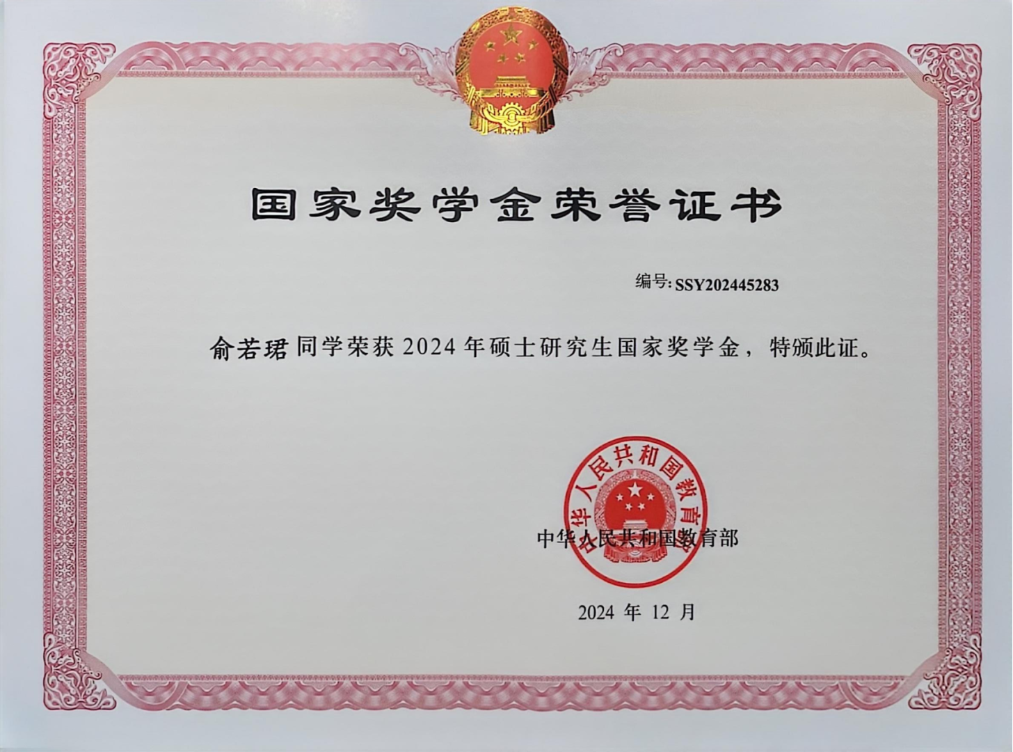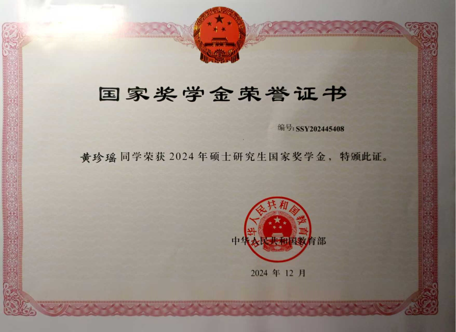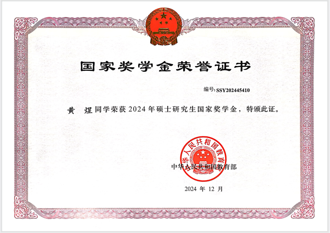 本科求学阶段,黄珍瑶始终秉持严谨求学态度,专业排名为15/291,连续四学期荣获校级综合奖学金,最终以优异成绩获得本校推免资格。进入研究生阶段后,她延续本科勤奋努力的学习态度,专业排名前30%,获得2024年度研究生国家奖学金、优秀新生特等奖学金、中期三等奖学金。