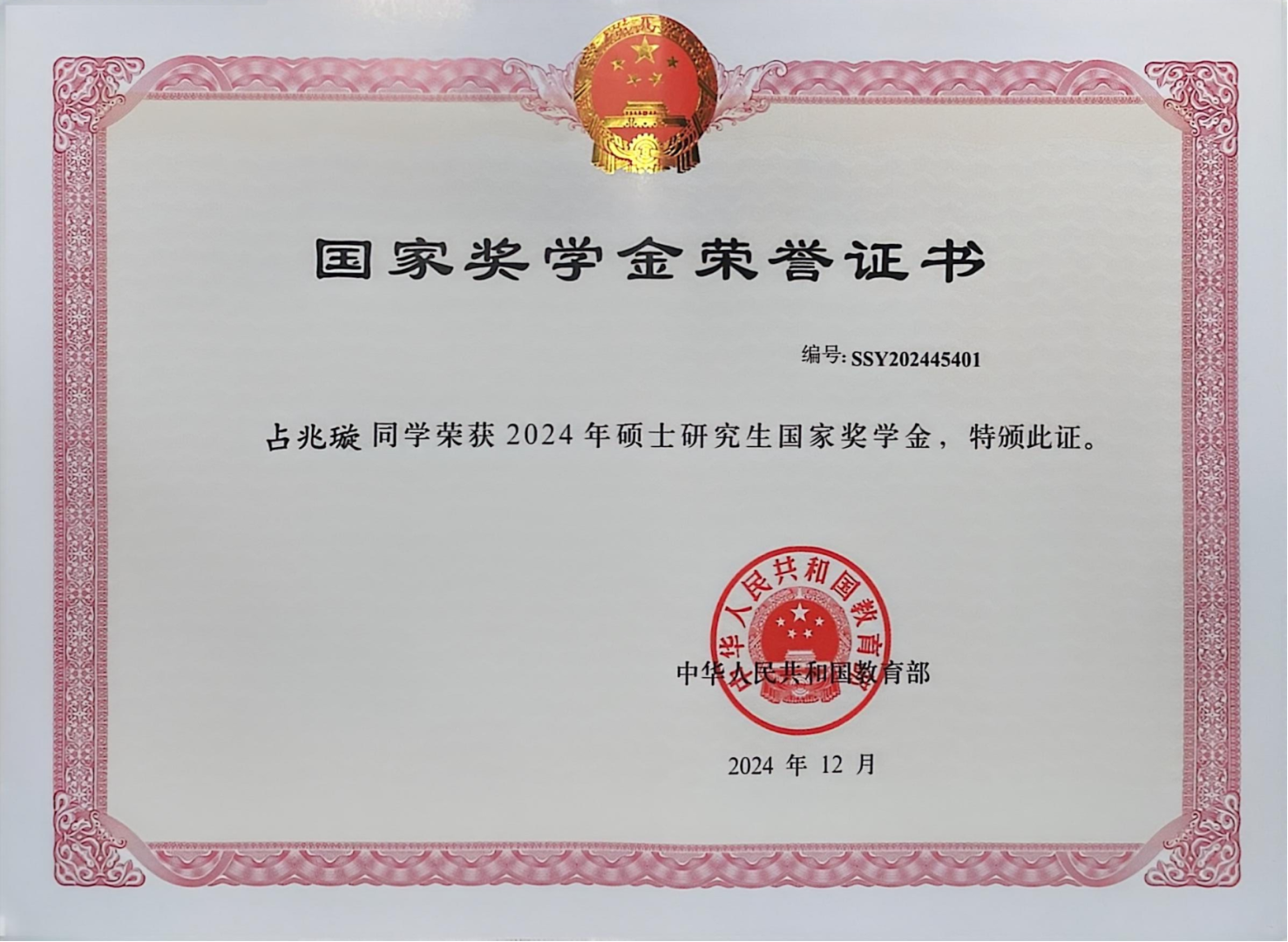 本科期间,占兆璇专业排名为14/291,曾连续五个学期获得福州大学综合奖学金,获得宏发助学金以及文化科技创新创业奖学金等,以校内推免专业第一的成绩保研本校。研究生期间,占兆璇始终延续本科脚踏实地、勤奋刻苦的精神,成绩优异,专业排名第一,获得2023年度国家奖学金、2024年度国家奖学金、福州大学硕士研究生优秀新生特等奖学金、福州大学全日制研究生助研奖等,并在研一和研二学年获得福州大学“三好学生”荣誉。