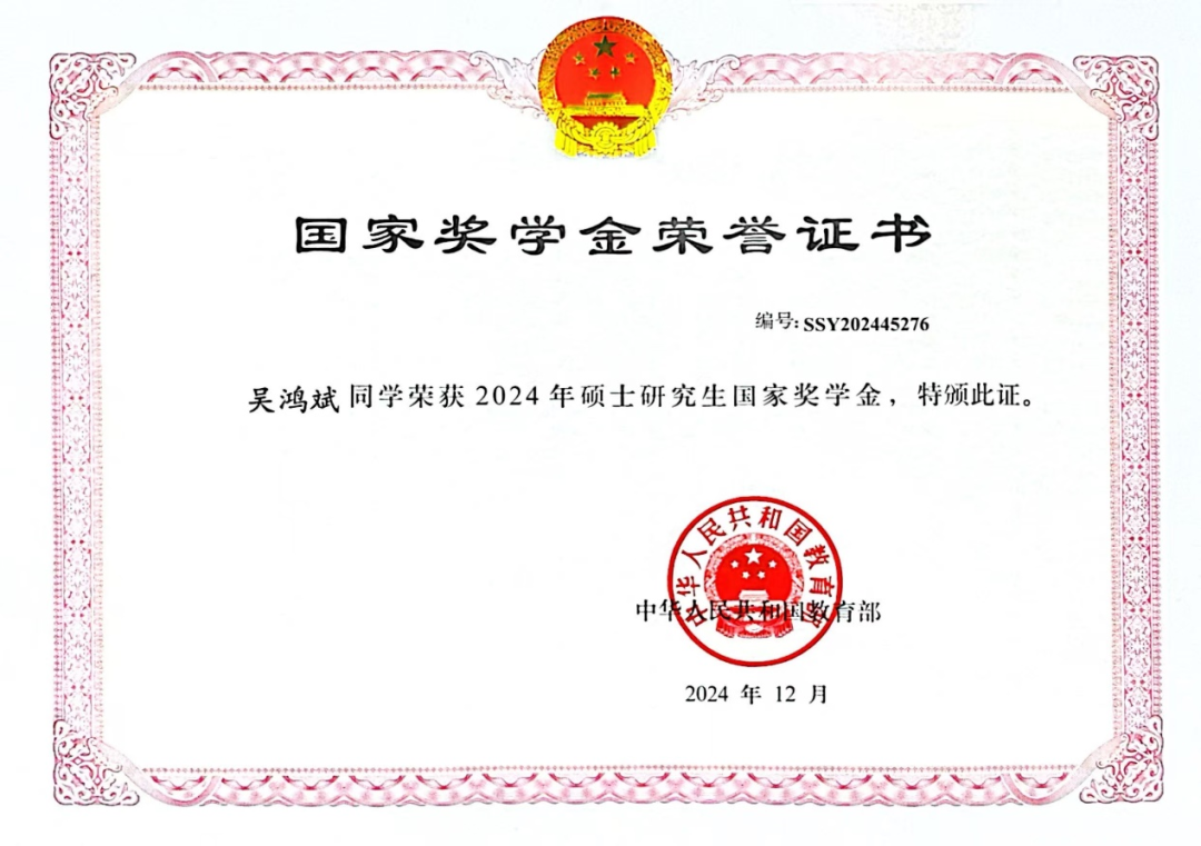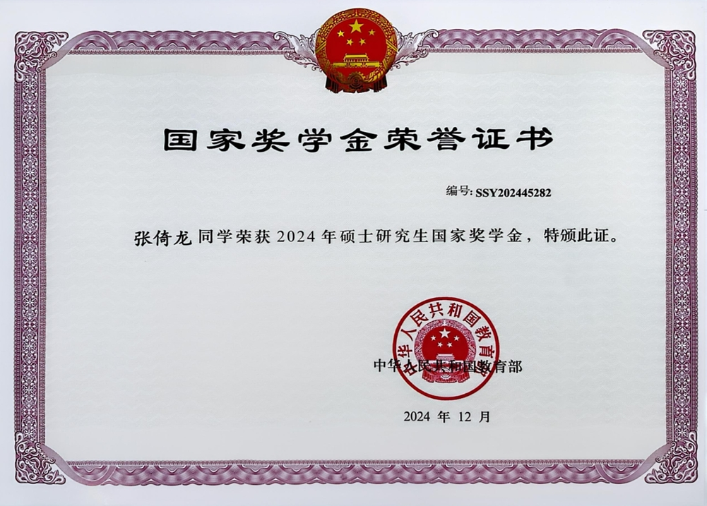 在研究生阶段,张倚龙始终秉持求真务实,精勤求学的态度,以严谨求真的学术作风和锐意进取的钻研精神面对专业领域的挑战。面对高强度的课程学习与科研任务,他始终保持精益求精的学术追求,通过系统化的知识构建与创新性思维训练,取得平均成绩88.8,学年绩点排名4/52的优异成绩,荣获国家奖学金。