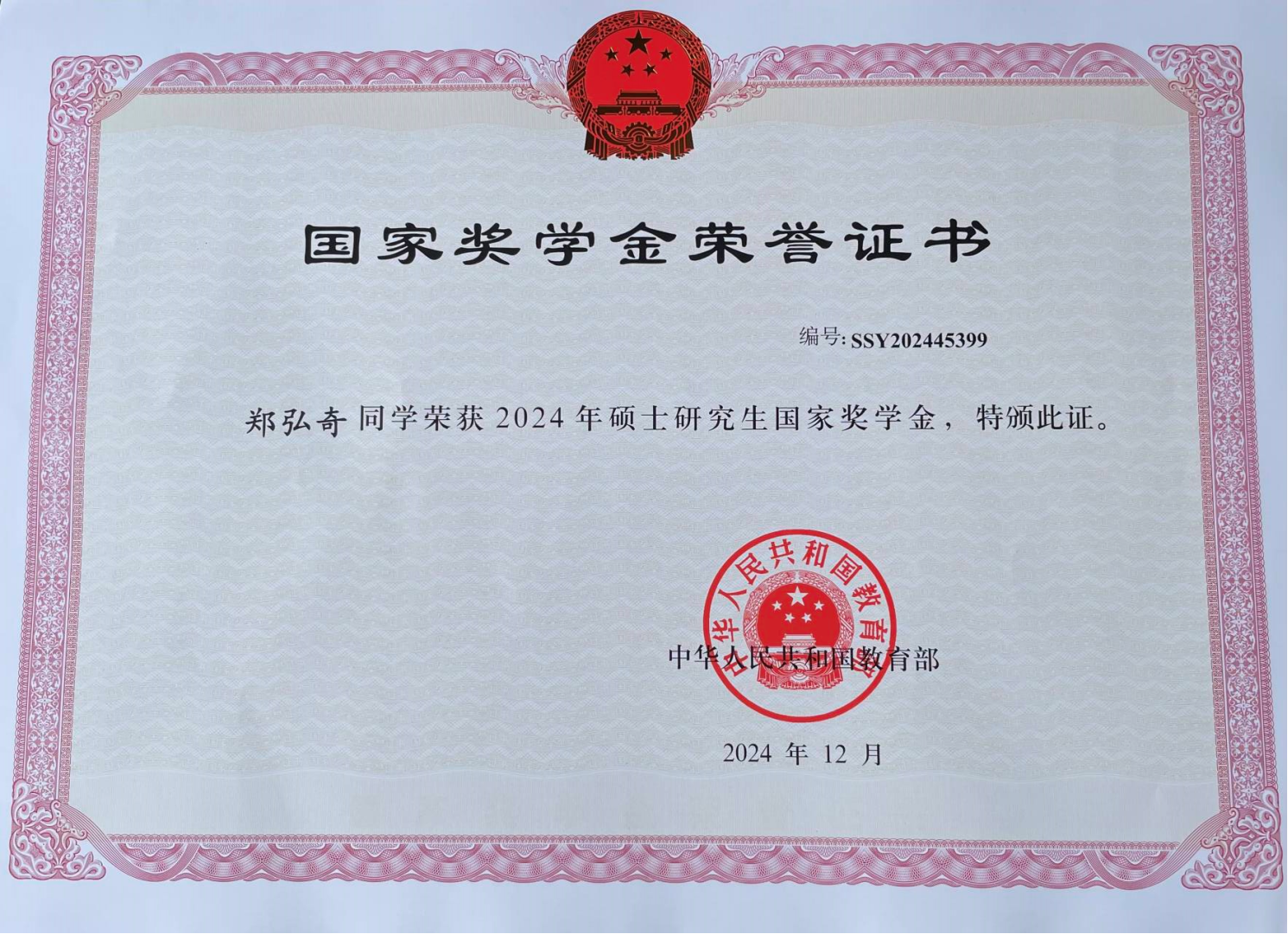 本科期间,郑弘奇专业排名为13/291,曾六次获得福州大学综合奖学金,两次获得国家励志奖学金,以较高的学业成绩排名推免保研本校。研究生期间,郑弘奇始终延续本科勤勉刻苦、态度端正、对待学业一丝不苟的精神,各科成绩均名列前茅,专业排名第一,获得两次国家奖学金、优秀新生特等奖学金、中期一等奖学金以及两次福州大学“三好学生”荣誉。