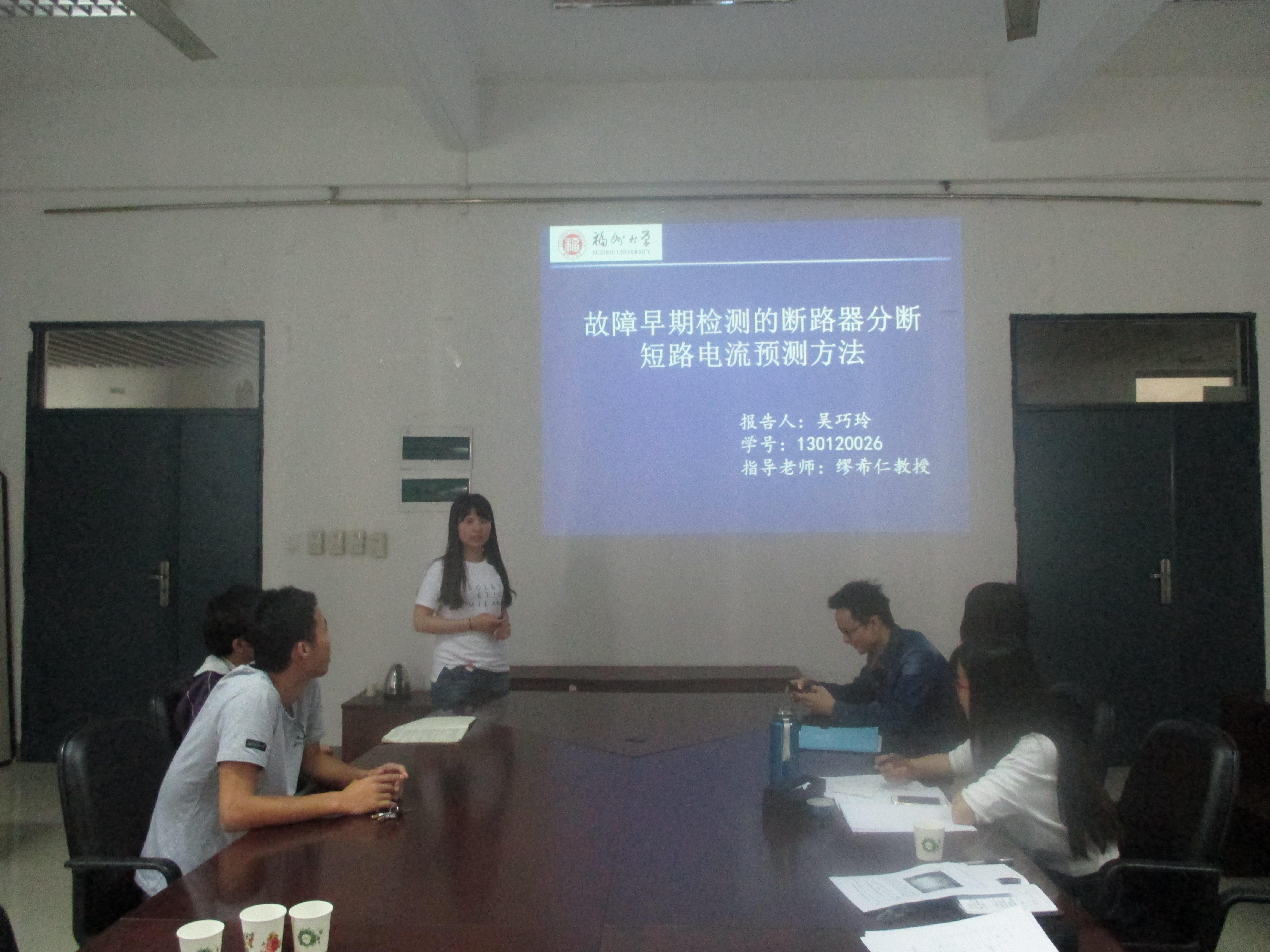 会议室举行了“中海创杯”研究生学术科技月学术沙龙第五场——电力系统专场。本次学术沙龙共有五位同学做了报告,内容涉及绝缘老化状态评估、配电网故障研究、配电网无功优化以及断路器故障早期的分断短路电流研究等不同领域内的技术,同时我们有幸邀请到郭谋发老师作为指导老师。