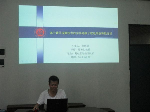 首先亮相出场的是林瑞聪同学,介绍紫外成像技术的劣化绝缘子动态特性分析的理解及研究;接下来的是李安娜同学对“区间-粒子群算法的油纸绝缘等效电路参数计算”的讲解,虚心的态度,积极地和老师讨论看法;接着李小江同学跟大家介绍了“低压电网负荷及漏电流综合监控系统”;然后同一个实验室的苏文博同学为我们讲解了“考虑不确定性因素的概率谐波潮流算法研究”的问题,并用精彩的PPT中展示了成果;其后的陈杨同学讲述的是“基于油纸绝缘等效电路的变压器微水含量研究”;最后是陈旭同学做关于双BOOST PFC数字化控制技术研究的分析,独特的理解和认真地科研态度在PPT满满的公式推导中可见一斑。